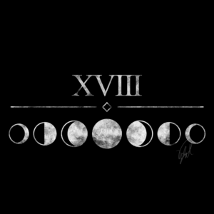 As you might be abel to figure out, this design shows the moonphases (without the new moon). At first I thought I’d leave it like that but than I decided to add something on top of it. I recently looked up some things about tarot cards and their designs (turns out there’s more then just one set…) which is why I thought: “Hey, let’s get a bit esoterical” and decided to put the number 18 on top, which is the number of the tarot card “The Moon” in the so-called “Major Arcana”.