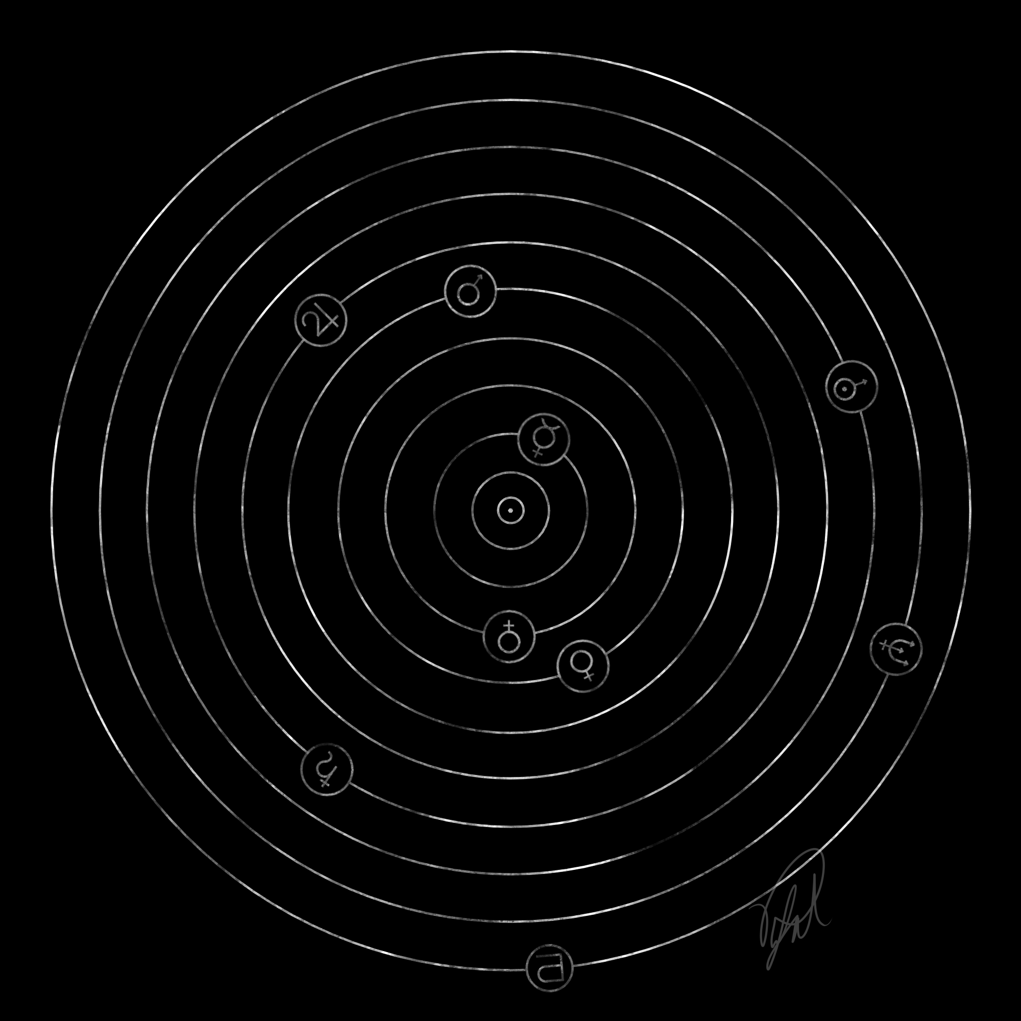 This design is supposed to be somewhat of a simple representation of our solar system. The proportions might be a little bit off (or maybe actually not realistic in the slightest) but the constellation of the planets, represented by their astronomic symbols, is actually (a bit vaguely) set on a specific date. So look for a solar system simulator and try to figure out which date it is. If you find it out you’ll get nothing. Not even a note that reads “congratulations”. But feel free to try anyways.