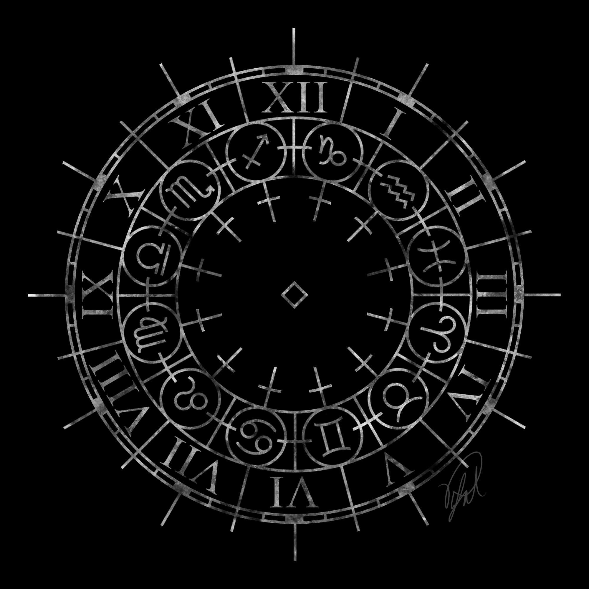 That’s the first design I had in mind. It’s basically a clock face, only that the twelve zodiac symbols are also integrated. In astrology every zodiac sign corresponds with about 30 days of the year inbetween two months, which is why I decided to place the signs like that. Astronomically incorrect but that wouldn’t work anyway, since there is actually one additional constellation in the ecliptic.