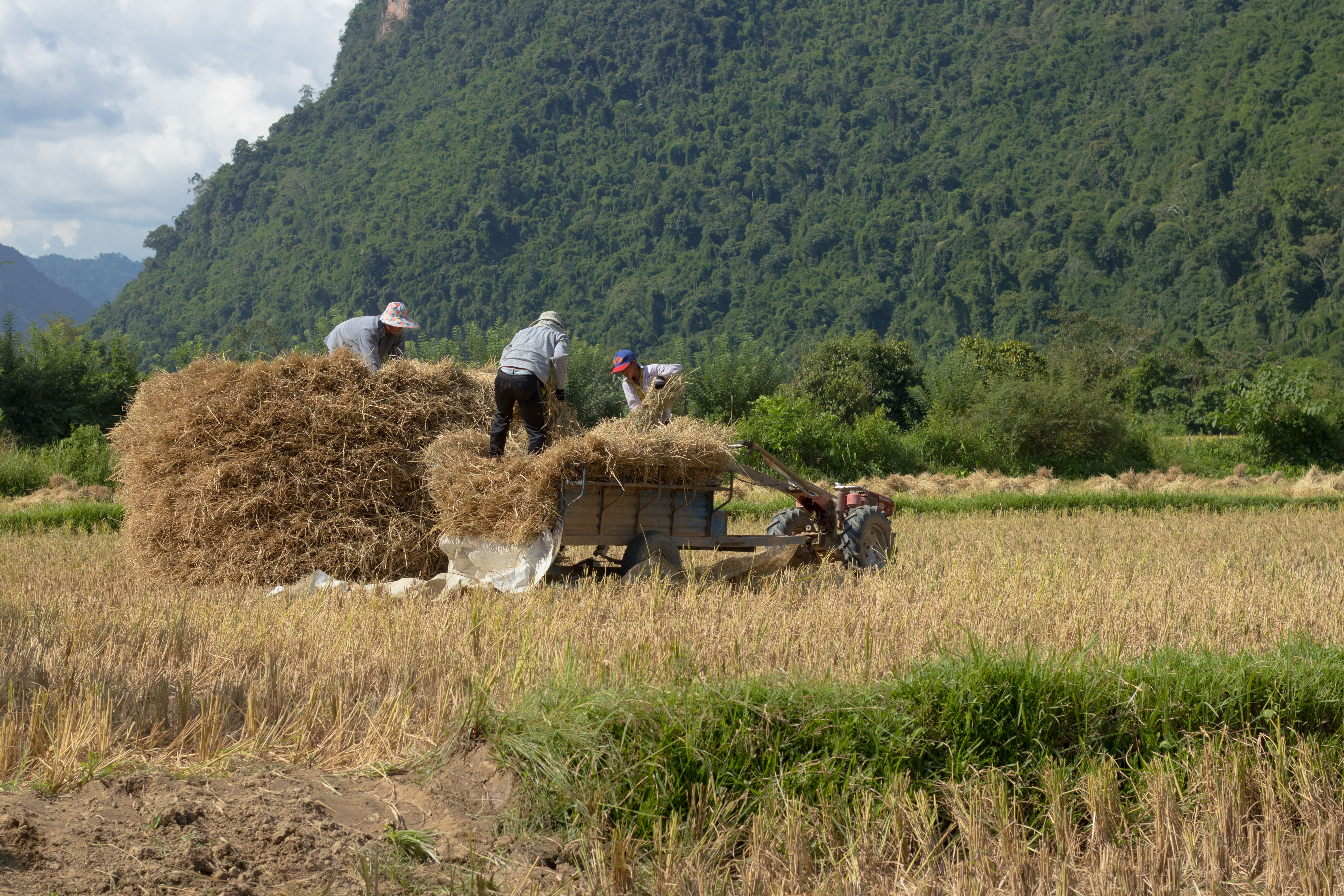 We first visited a place called “Blue Lagoon”, where people enjoyed swimming and jumping into the water. Then, we climbed up a little to make a small tour through Tham Phu Kham Cave. We got some lunch and continued to cycle towards some small villages, where we saw a bit of local lifestyle and learned a bit about Lao minorities. Furthermore, it’s harvest time, which meant that a lot of farmers and helpers collected the rice plants. The farmers still do a most of this work by hand because in a very poor country like Laos, only a few are able to buy agricultural machines.