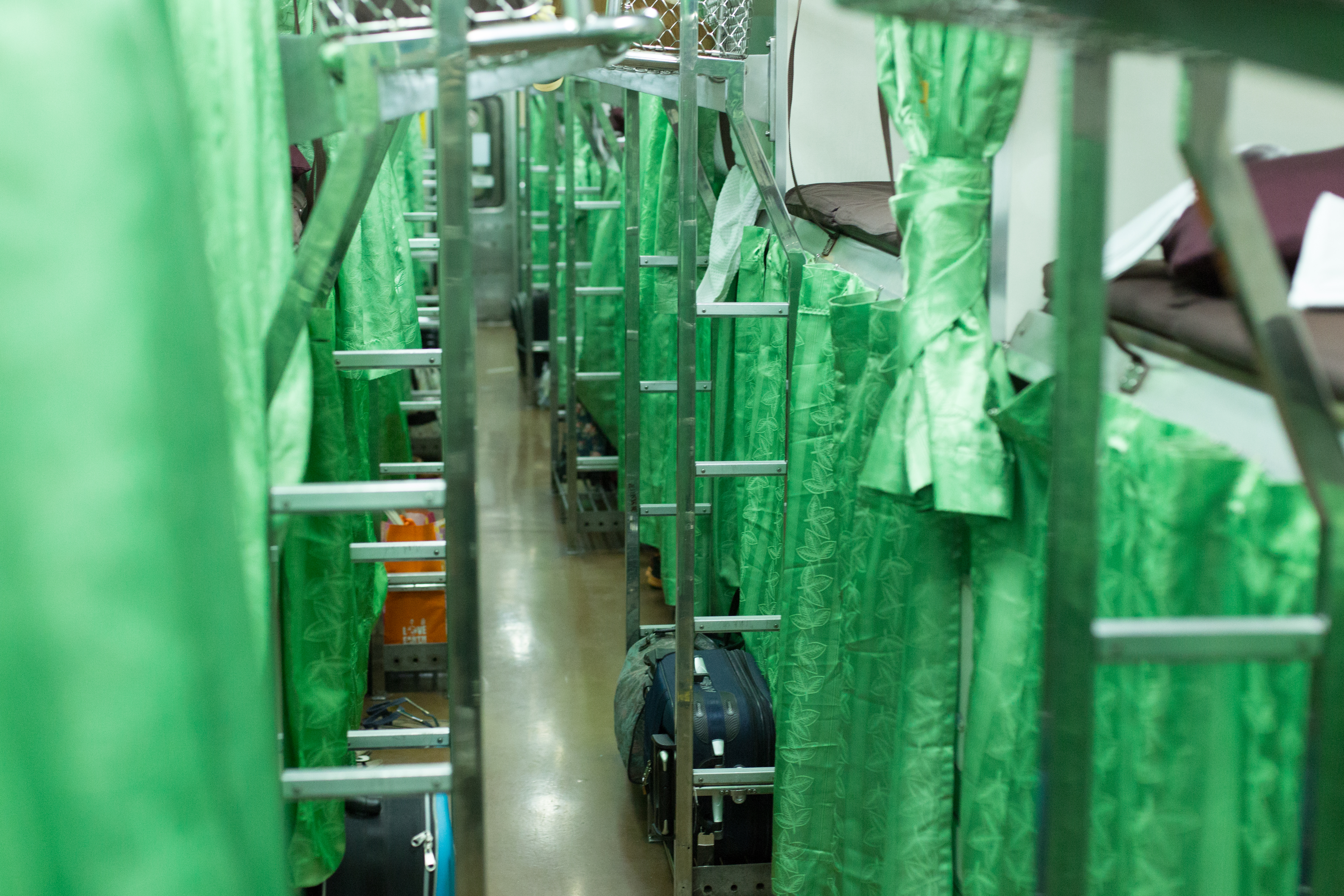 The second part is the State Railway of Thailand (SRT) line from Nong Khai to Bangkok. The line was opened in 1958 and is about 621km long and has about 100 stations. The night train ride takes more than 12 hours, even if he passes maybe 99 of them. The train runs up to 100km/h average speed on the most of the time single-tracked line which feels even faster because of the narrow-gauge.